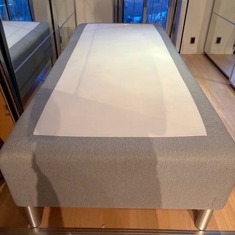 Pæn og velholdt boksmadras inkl. topmadras med nyvasket betræk fra ikke-ryger hjem.