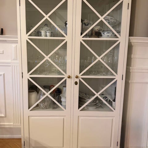 Skabet har almindelige brugsspor og fungerer upåklageligt. Det bruges i øjeblikket som opbevaring af duge og glas, men har utallige andre anvendelsesmuligheder.