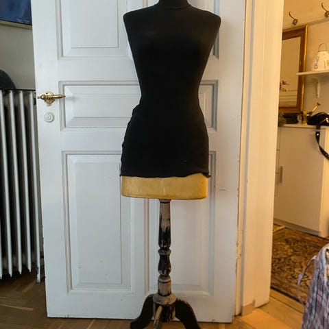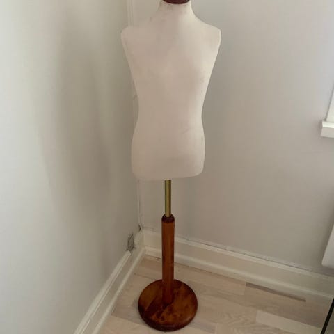 Skrædderbuste dame i hvid tekstil med træfod og træhoved. Kan deles i 3 dele. Str 38 / 40