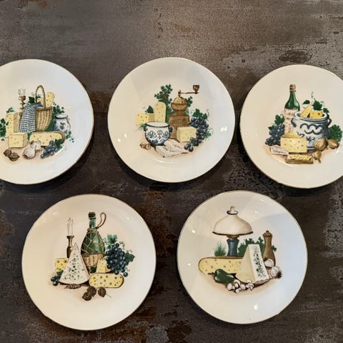 6 forskellige oste tallerkner med guldkant fra 1960 èrne. 19 cm i dia.