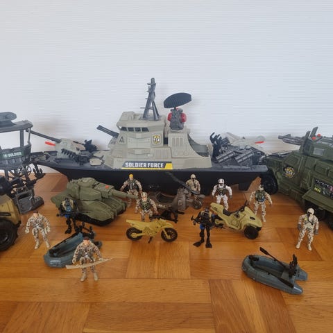 Stor samling af blandet Somdier Force og Police Force. Rigtig fin stand. En kasse med en masse figurer og flere store ting bl.a. to tanks, en kampvogn og et skib.