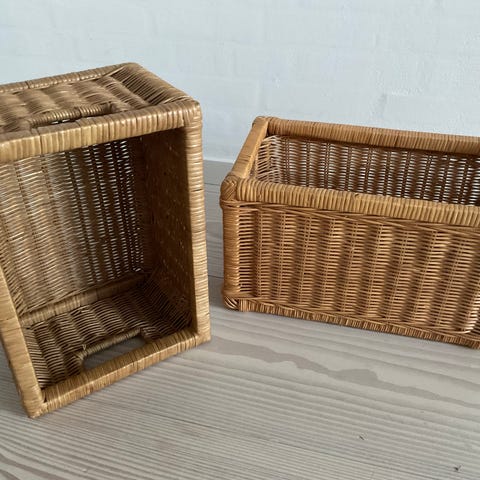 IKEA flettede opbevaringskurve i hvidt flet. Kurvene er rektangulære med integrerede håndtag i siderne, som gør dem nemme at løfte og flytte. Egnede til opbevaring af legetøj, tøj eller andre småting i børneværelse eller hjemmet generelt. Sælges som sæt med flere kurve i samme stil og farve.