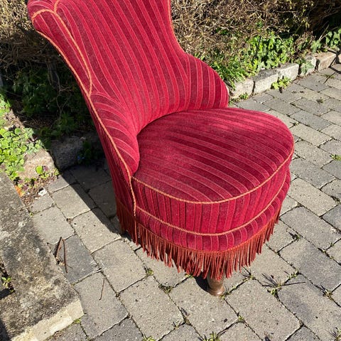Antik lænestol med høj ryg og armlæn i afdæmpet karrygul velour. Stolen har vingeformet ryglæn, polstret sæde og træben med svungne former. Bagside og kanter er afsluttet med dekorative møbelsøm. Velegnet som læse- eller hvilestol i stue eller læsehjørne.