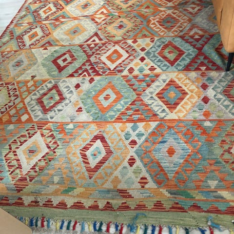 SENDER GERNE MOD BETALING..Stort og smukt håndvævet / håndknyttet kelim tæppe i uld. Perfekt til stuen eller under spisebordet. Har også andre kelim tæpper og kelim puder til salg.