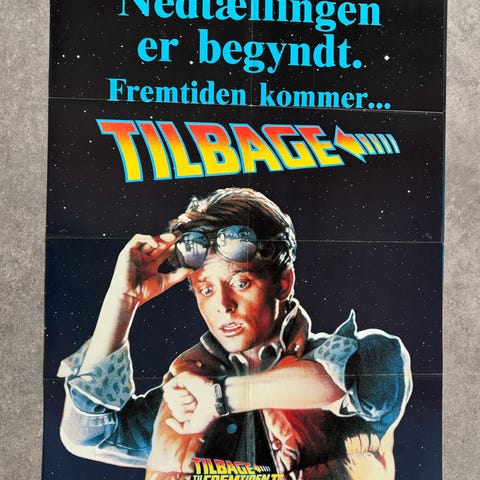 Tilbage til fremtiden filmplakat med dansk titel og tekst. Plakaten viser motiv fra filmen med hovedpersonen foran bilen samt filmens logo og credits nederst. Egnet til indramning og ophængning som vægdekoration for samlere af filmplakater og filmmerchandise.str 62/85 orginal Filmplakat flot stand