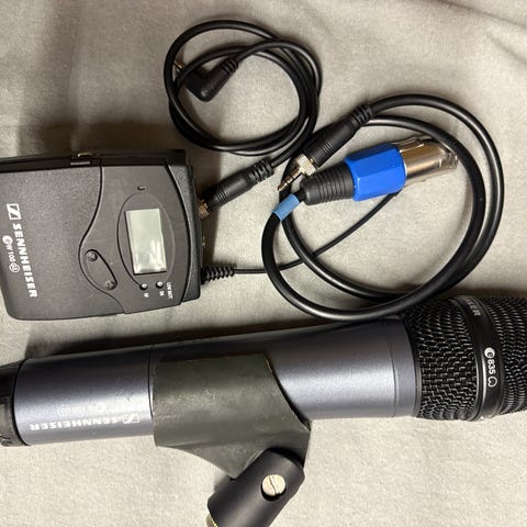 Sennheiser trådløst mikrofon sæt med lommesendere og modtager. Sættet omfatter mindst én lavaliermikrofon med minijack-stik samt tilhørende kabler, herunder XLR-kabel til tilslutning af modtager til mixer eller andet lydudstyr. Enhederne drives af AA-batterier og har display med frekvensangivelse i MHz samt indikatorer for RF- og AF-niveau. Velegnet til brug ved taleoptagelse, præsentationer, interviews og lignende lydopgaver, hvor der ønskes trådløs overførsel fra mikrofon til modtager.