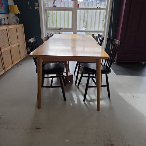 FDB MØBLER C62E BJØRK RUNDT SPISEBORD MED UDTRÆK, OG TO TILLÆGSPLADER. SORT EG MED LINOLEUM PÅ BORDPLADER. BORDET MÅLER 115 CM I DIAMETER. FULD LÆNGDE PÅ BORDET MED BEGGE TILLÆGSPLADER ER 215 CM. BORDET ER MEGET VELHOLDT OG PLEJET MED LINOLEUMS SÆBE. ENKELT LILLE MÆRKE I BORDKANT.