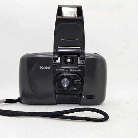 Kodak KE40 Easyload analog kamera i sort plast. Kameraet bruger 35 mm film og har indbygget blitz. På fronten ses et 32 mm Ektanar-objektiv. På toppen er der LCD-display med simple betjeningsknapper til bl.a. selvudløser og optælling af eksponeringer. Bagsiden har søger og filmrum med Easyload-system til nem ilægning af film. Velegnet til generel hverdags- og rejsefotografering på 35 mm film.