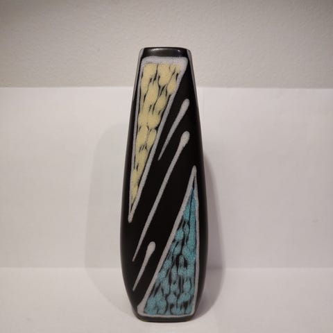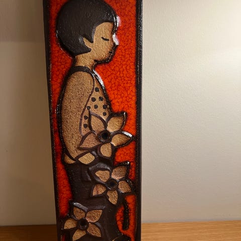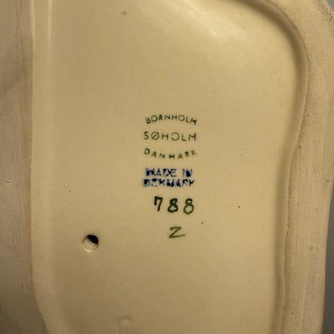 Søholm keramik flaskeholder med tilhørende propfigur. Figuren er formet som en person med hvid trøje med røde prikker, blå bukser og sort fodtøj. Nederst er der prop med figurhoved, som kan bruges til at lukke en flaske. Undersiden er mærket Søholm Denmark, Made in Denmark samt modelnummer. Velegnet som dekorativt indslag i hjemmet eller som samlerobjekt inden for dansk keramik.