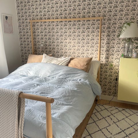 Sengestel med hovedgavl. Rammen står på ben og har en midterstøtte til lamelbunde eller anden bund. Velegnet som sengestel i soveværelse eller gæsteværelse. Mindre brugsspor kan forekomme på kanter og hjørner, som vist på billederne.