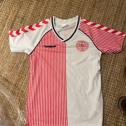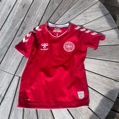 Hummel Danmark fodboldtrøje til børn i størrelse 164. Trøjen er rød med mønstret struktur og hvide detaljer ved ærmer og skuldre. Egnet til fodbold og anden sport eller som fritidstrøje. Kortærmet model i let materiale, der giver god bevægelsesfrihed under aktivitet.