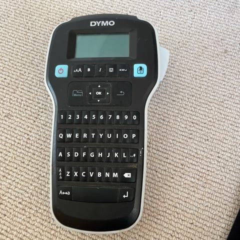 Dymo Tag labelmaker i blå plast med digitalt display og fuldt tastatur til udskrivning af etiketter. Enheden bruger Let Tag-labeltape, og på billederne ses tre ruller tape inkluderet. Labelmaskinen er egnet til mærkning af fx mapper, kasser, køkkenopbevaring og andre genstande i hjem eller på kontor. Strømforsyning sker via batterier (ikke synlige på billederne).