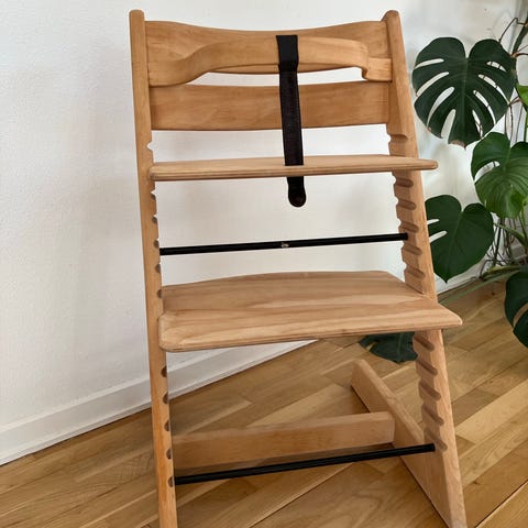 Stokke Tripp Trapp højstol i naturfarvet træ. Klassisk justerbar højstol med flytbar sædeplade og fodplade, der kan tilpasses barnets højde. Egnet som spise- og siddeplads ved bordet for børn i forskellige aldre. Fremstillet i massivt træ med metalstænger som fodstøtte og stabiliserende elementer.