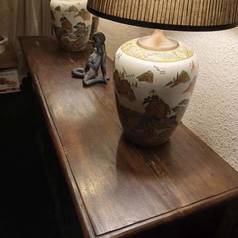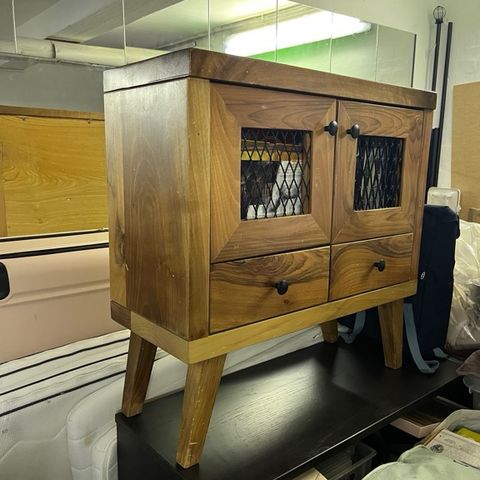 Vi købte 2 skænke. På billedet er den ene skænk sat op. Den anden skænk er endnu ikke bygget og ligger i sin kasse. Den har en lille ridse på lågen (se billede).