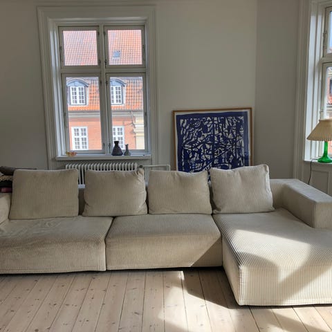 Modulsofa i fløjl til salg. I alt fire moduler inkl. chaiselong. Ligner en Eilersen, men kan ikke sige det med sikkerhed. Cirka tre meter lang i versionen på billede 1 med tre moduler. Trænger til en ombetrækning.