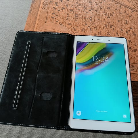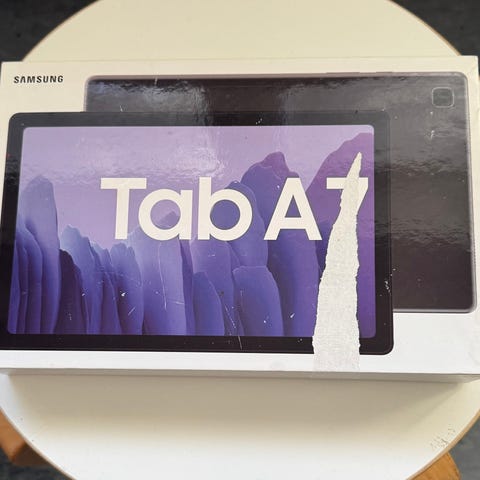 Samsung A7 tablet, 10,4 - (model SM-T500) købt ult. 2021 - Cover der kan bruges så tablet let kan bruges til film, tv etc. følger med. Den er faktisk ikke brugt, da den har fungeret som en mulig back-up før jeg købte ny bærbar, hvor jeg kun havde mobil. Ideel til ferierejse brug etc. Udover cover medfølger oplader..