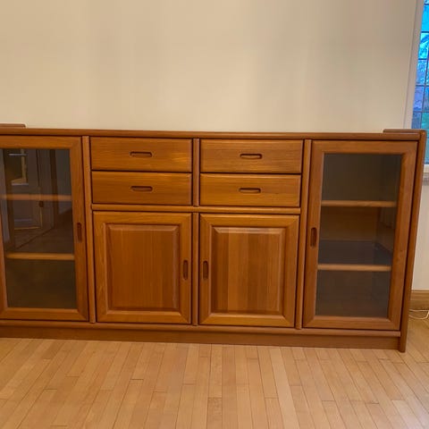 Pæn skænk med 4 låger og blandet hylder i glas og træ, udtræksskuffer, og spejl. Rigtig fin stand.