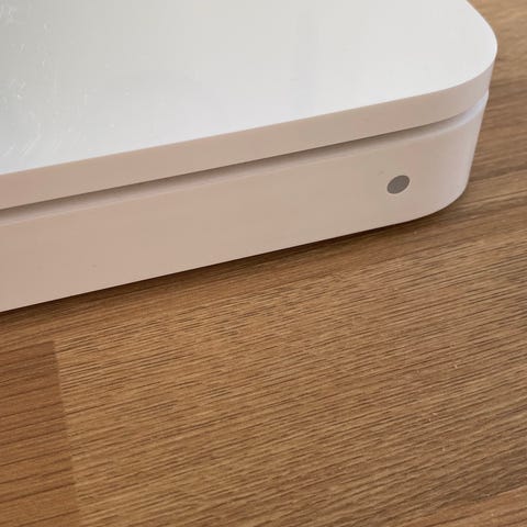 Apple AirPort Extreme router i hvid. Trådløs router i tårnformet design med flere ethernet-porte på bagsiden til kablet netværksforbindelse samt nettilslutning. Enheden er egnet som central router i hjemmenetværk til fordeling af internetforbindelse til computere, telefoner og andre enheder via WiFi og kabel.