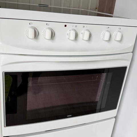 Voss komfur glaskeramiske med 4 kogezone med lys i knapperne varmluft ovn med selvrens magasin skuffe sokkel højde kan justeres fra 85 til 92 cm med kabel så det er klar til at tilslutte pæn og velholdt