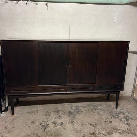 Pænt teaktræschatol i fin stand. 3 store skuffer, 4 små skuffer, udtræksplade og med spejl og glaslåger