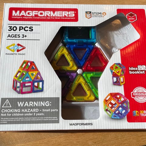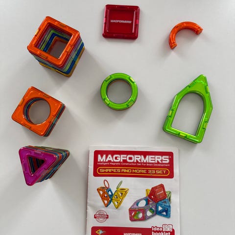 Magformers. Sæt bestående af 13 trekanter og 24 firkanter hvoraf én har en mand i midten plus 2 hjulplader til at bygge med. Inkl. billedark med inspiration til at bygge. Fra røgfrit hjem uden husdyr.