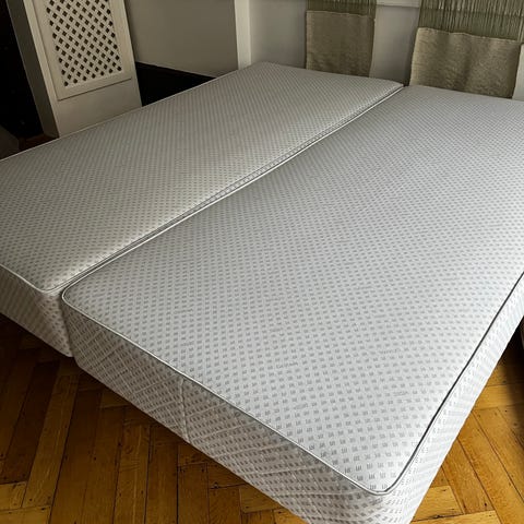 Sengen består af en polstret bund med ben og en hvid madras/topmadras øverst. Neutralt design, der passer ind i de fleste soveværelser. Velegnet som enkeltseng til daglig brug eller gæsteværelse. Materialer fremstår som tekstil og skum/komfortlag i madrassen baseret på billederne.