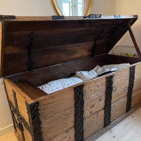 Træskiste med buet låg i blåmalet træ. Indvendigt fremstår kisten i naturtræ med synlige brædder. På fronten er der malet navn og årstal 1868. På siderne er der metalhåndtag til at løfte kisten. Velegnet som opbevaringskiste eller dekoration i bolig, gang eller soveværelse.