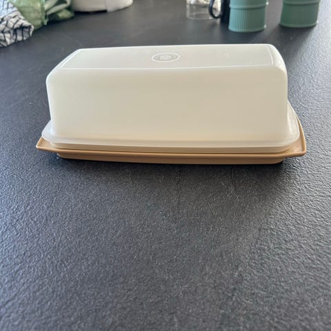 Tupperware lille Osteboks i plast med hvid bund og halvgennemsigtigt låg. Kvadratisk form, velegnet til opbevaring af ost i køleskab. Låget slutter tæt og ventilering til ost uden at det lugter i køleskabet. Størrelsen fremgår af billederne med målebånd