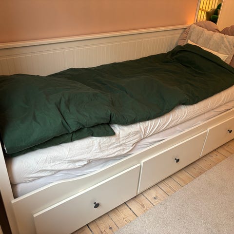 IKEA dagligseng med opbevaring i hvid. Sengen har en madrasstørrelse på 80x200 cm, som kan udvides til dobbeltseng med en samlet sengebredde på ca. 160 cm og sengelængde på 200 cm. Modellen har lamelbund og tre integrerede skuffer under sengen til opbevaring. Ryg- og gavlpaneler gør, at sengen også kan bruges som sofa i dagtimerne. Velegnet til brug i soveværelse, gæsteværelse eller børneværelse, hvor der er behov for både soveplads og opbevaringsplads.