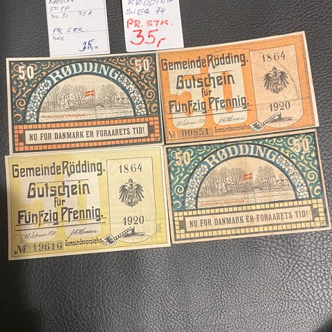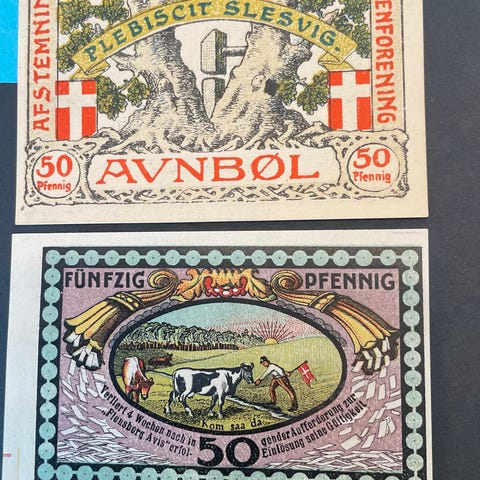 Notgeld sedler på 50 Pfennig fra Dynt og Jünth. Øverste seddel er mærket "Fremtidens Haab" med dansk flag, årstallene 1864 og 1919 samt motiv af kystlandskab. Nederste seddel er en "Gutschein der Gemeinde Jünth" med landskabsmotiv og pålydende værdi 50. Sedlerne er egnede til samlere af historiske pengesedler og lokalnoter.