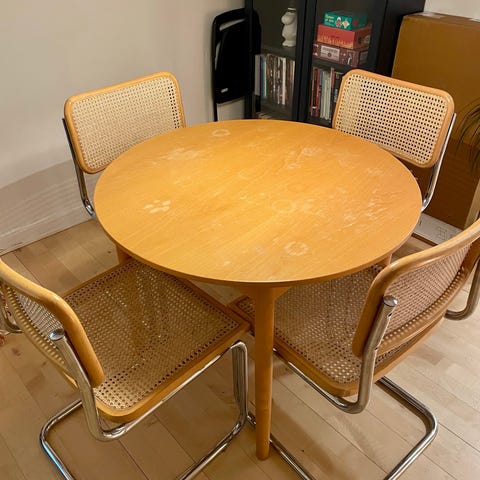 Lille rundt spisebord i massivt træ i størrelsen 110 med metalstel. Til den lille spisestue. Pladen er i massiv egetræ og 5 cm tyk. Pladen trænger til en slibning og ville have godt af en behandling evt. sæbespåner. Er delt fra benene, så til at hente. Bemærk at pladen er tung, da den er massiv. Pris kan forhandles.
