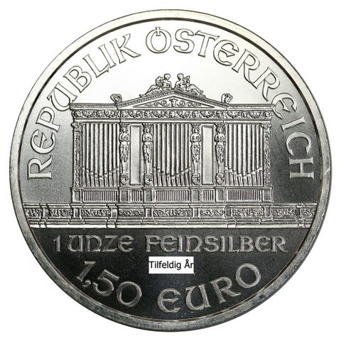 Wiener Philharmoniker guldmønt 1 ounce. Mønten er rund og fremstår i guldfarvet metal med motiv af instrumenter fra Wiener Filharmonikerne på den ene side og koncertsalen på den anden side.