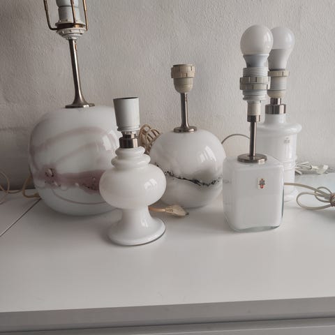 2 stk. bordlamper med uoriginale ovale stofskærme. Virker helt som de skal. Ledningerne og fatningerne er gulnede, men ellers fremstår lamperne fine. Ingen skår i glasset. Prisen er pr. stk. og incl. fragt