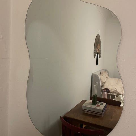 "Dette luksuriøse spejl har en organisk silhuet med facetslebet kant og en glastykkelse på 4 mm. Velegnet som vægspejl i fx entré, soveværelse eller stue."
