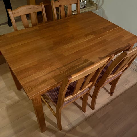 Spisebord m/ 4 stole i massiv eg (med tillægsplader)