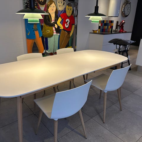 Købt i 2017 hos Danbo Møbler i Kolding, vi var selv med til at vælge form, farver og stof. Nyprisen var 20000 kr. For bord og 4 stole.