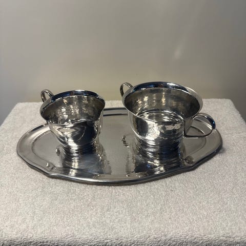 Sølvfarvet tekande sæt med flødekande sukkerskål og bakke