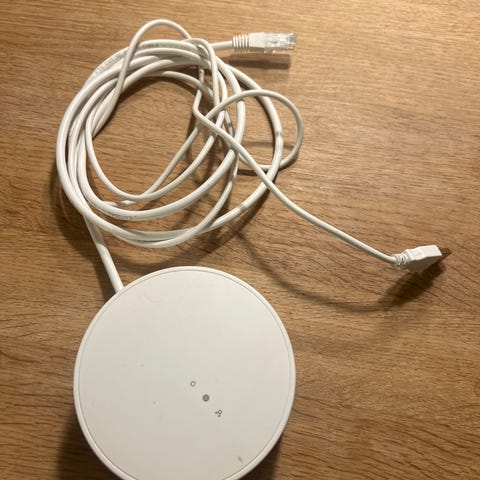 Ikea Trådfri Gateway netværkskomponent i hvid. Enheden fungerer som gateway til Ikea Trådfri smart home-system og forbinder kompatible lamper og andre enheder til hjemmenetværket. Gatewayen tilsluttes med medfølgende strømforsyning og kan monteres på væg via beslag på bagsiden. Egnet som central enhed i et Trådfri-baseret lys- og smart home-setup.