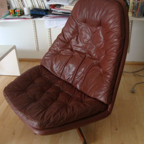 Dansk design fra 1970’erne. Sort læder og der mangler nogle af knapperne og har aldersrelaterede brugsspor. Den kan dreje rundt og med klassisk fod fra den tid. Den har fantastisk siddekomfort.