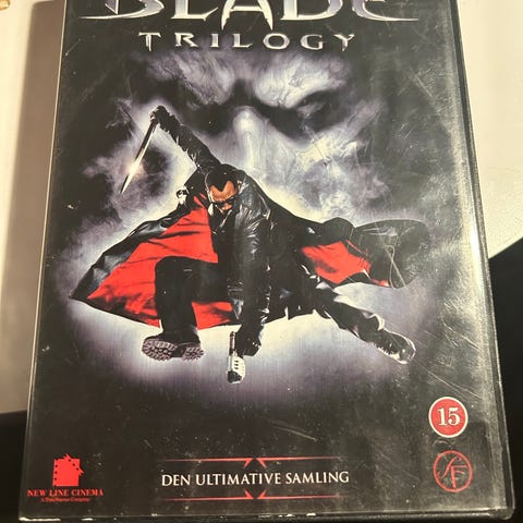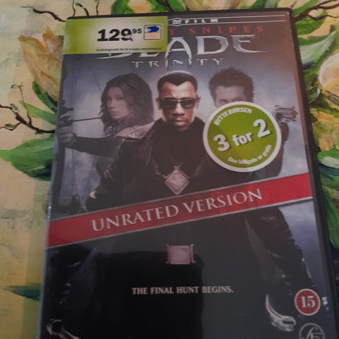 Blade Trinity dvd. Filmen er udgivet på dvd og leveres i standard dvd-cover med trykt for- og bagside. Disken er en spillefilm i Blade-serien og er egnet til afspilning på dvd-afspillere, der understøtter dvd-formatet.