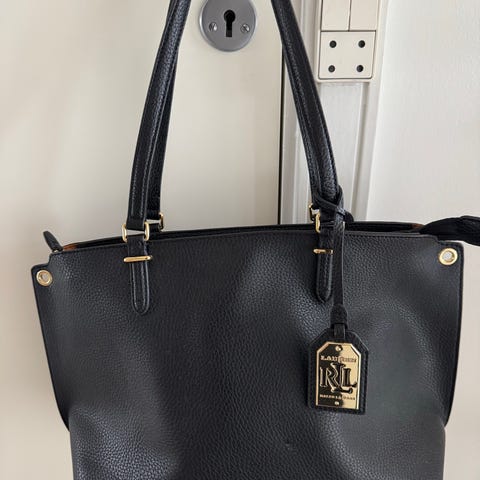 Ralph Lauren sort lædertaske/shopper. Tasken er fremstillet i læder med små riller og dobbelte hanke. Der hænger også et lille tag med RLL monogram i guld.