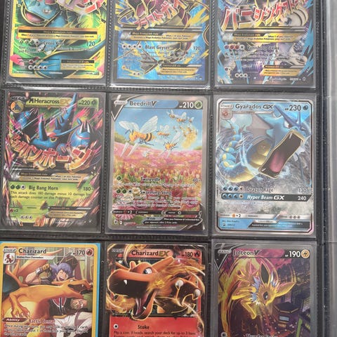 Pokémon samlekort blandet lot. Mapperne indeholder forskellige Pokémon-kort, herunder flere EX, GX, Mega og andre holo/foil-kort fra forskellige serier og udgaver. Kortene kan bruges til samling eller spil. Antal, specifikke serier og årgange fremgår ikke præcist af billederne og bør afklares, hvis det er relevant for køber.