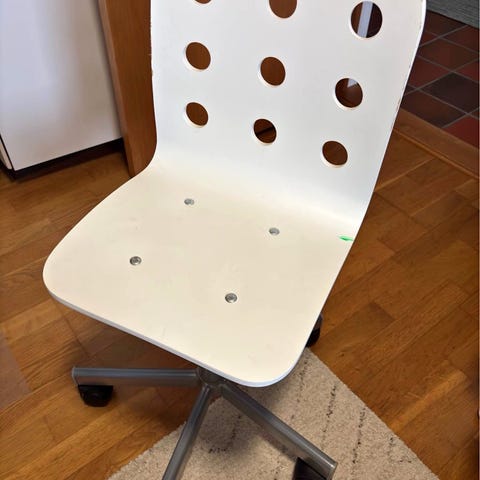 IKEA børnestol på hjul med polstret sæde og ryglæn i grøn tekstil og hvidt stel. Stolen har fembenet fod med hjul, som gør den let at flytte rundt. Sædehøjde kan justeres med gaspatron, så den kan tilpasses barnets højde. Egnet til brug ved børneskrivebord eller arbejdsplads på børneværelset.
