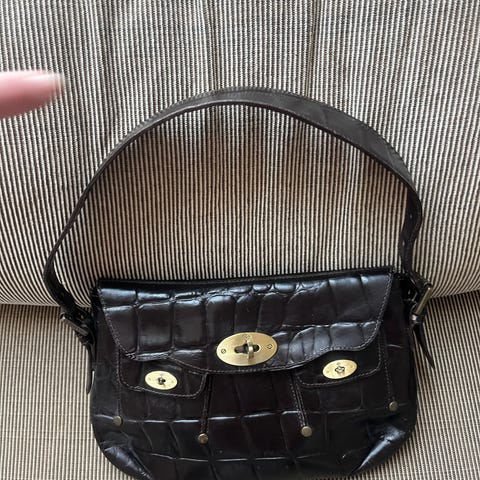 Mulberry skuldertaske i sort læder med præget mønster. Tasken bæres over skulderen med en justerbar rem.