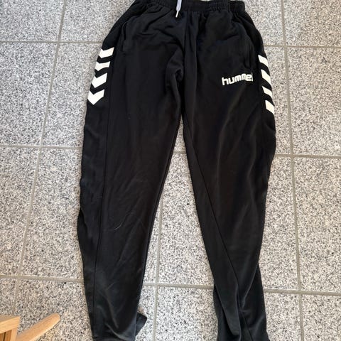 Hummel træningsbukser unisex i størrelse s Bukserne er sorte med Hummels karakteristiske hvide pile ned langs siderne og Hummel-logo på låret. Elastik i taljen for bedre pasform. Egnede til sport og træning eller som afslappet fritidsbukser. Unisex-model i mindre størrelse, som kan passe både unge og voksne med tilsvarende mål.