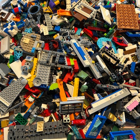 LEGO klodser blandet lot. Kassen indeholder forskellige LEGO dele og byggeelementer i blandede farver og størrelser. Der ses blandt andet dele til køretøjer, bygninger og andre konstruktioner. Velegnet som supplement til eksisterende LEGO samlinger eller til fri byggeleg.
