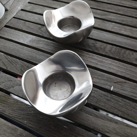 Georg Jensen fyrfadsstager i metal. Sættet består af fire runde fyrfadsstager med blank metaloverflade og indsats til fyrfadslys. Velegnet til brug på bord, hylde eller vindueskarm som enkel lysindretning i hjemmet.