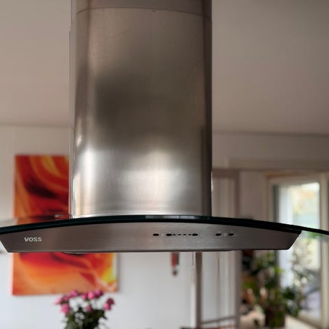 Emhætte i vægmodel udført i rustfrit stål og glas. Emhætten har buet glasfront og centralt placeret filtermodul i metal. Den er egnet til montering over komfur eller kogeplade i køkken og er beregnet til udsugning af madlavningsos. Designet kombinerer en lodret skorsten i metal med en glasplade, der dækker emfangsområdet. Velegnet til brug i private køkkener, hvor der ønskes en væghængt løsning med synlig skorsten.
