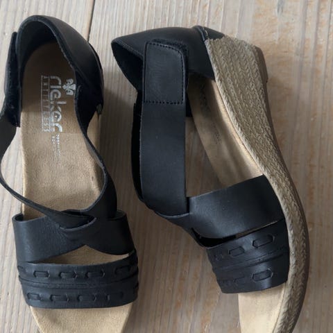 Rieker sandaler i str. 38. Modellen er sorte med quiltet overdel og stor guldfarvet kædedetalje foran. Åben hæl og åben tå med bred rem over foden. Sandalerne har kraftig, mønstret sål i sort materiale, der giver godt fodfæste. Velegnet som hverdagssandal eller fritidssandal i sommerhalvåret.