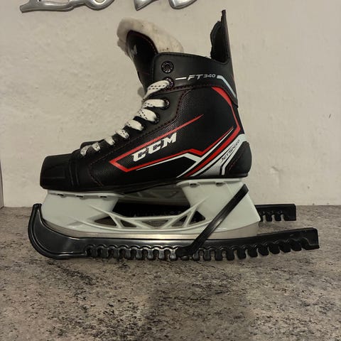 CCM ishockeyskøjter i børnestørrelse 33. Skøjterne er sorte med hvide snørebånd og hvid holder/klinge. De er velegnede til begynder ishockey og skøjteløb for børn. Overdel i syntetisk materiale med polstret pløs og ankelstøtte for stabilitet på isen. Størrelsen er 1 (EUR 33,5)